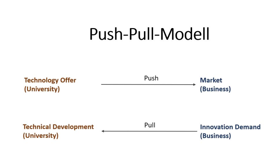 When it comes to technology transfer, there are initially two directions of orientation, whereby the push-pull model is applied here, because on the one hand we have inventions, technological achievements that are pushing their way onto the market (push), and on the other hand we have companies that are constantly looking for innovations and sometimes seek the support of universities (pull). Both supply and demand lead to transfer, only the orientation and the terms of the contract change.