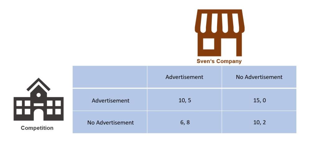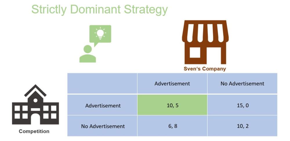 There are different strategies for all game variants. The easiest strategy to determine and predict is the dominant strategy, or more precisely, the strictly dominant strategy. It promises the greatest benefit/profit for the players. To illustrate this, let's use an example from studyflix.de and call the new founder Sven: Sven opens a new company and wants to establish himself on the market against the big competitor in the lemonade business. The question Sven asks himself is whether he should place more advertising, although he does not know what the advertising strategy of the competition will look like. However, the effect of his advertising will also influence the advertising behavior of the competitor company.
