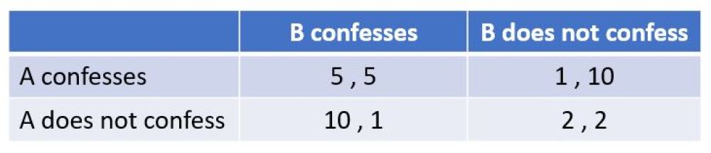 Example reading: 5,5 in the top left-hand box means that both A and B get 5 years if they both confess; similarly, 1,10 in the top right-hand box means that A gets 1 year and B gets 10 years if only A confesses, and so on.
